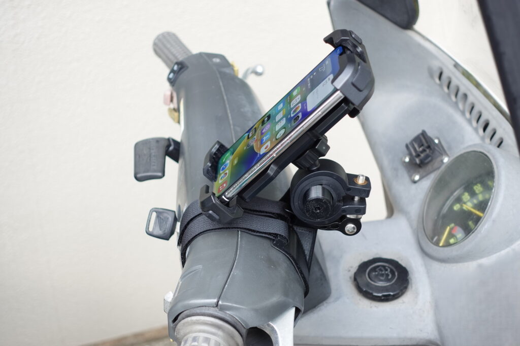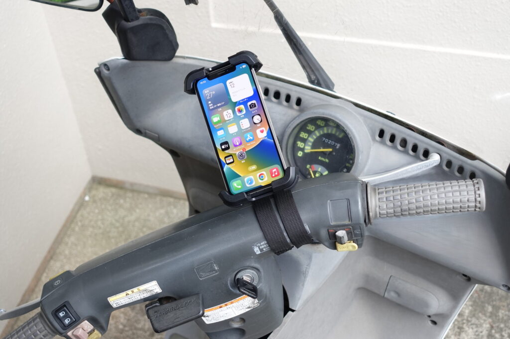 市販のスマホホルダーと一般的なスマホ(iPhone)を取り付けました。