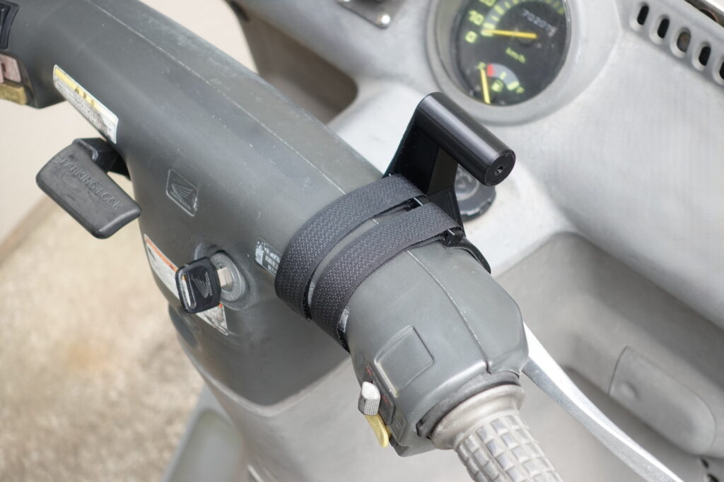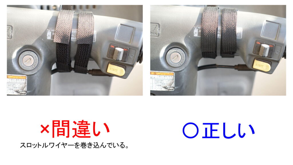 (↑画像)上記のように、ハンドル右側に取り付ける場合におきまして、マジックバンドを巻き付ける際には、スロットルワイヤー(アクセルワイヤー)を一緒に巻き込まないようにしてください。